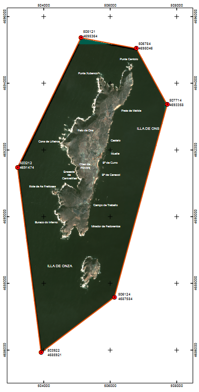 Comprende él espacio marítimo-terrestre poligonal alrededor de las islas de Ons y Onza e islotes adyacentes, delimitado por los siguientes vértices: